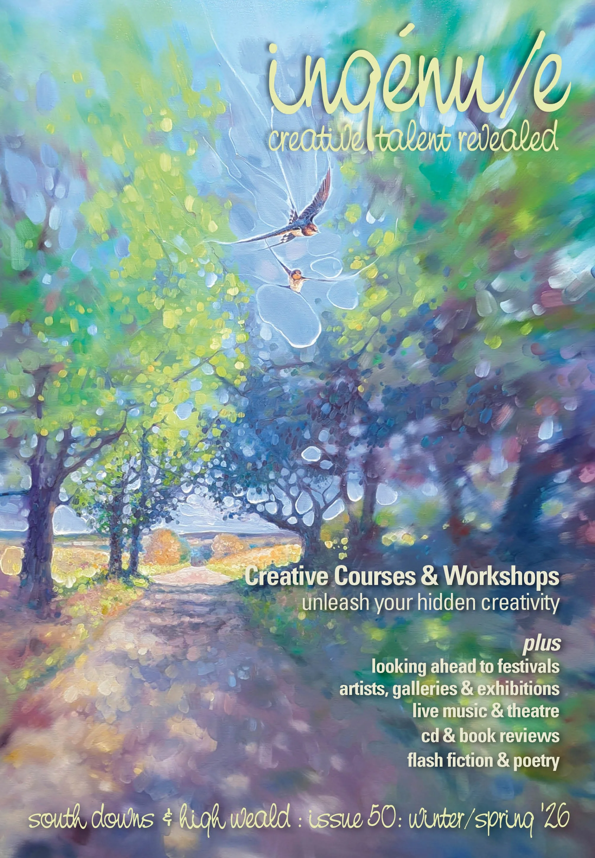 Our cover artist is Gill Bustamante, Sussex artist and winner of the 2020 BBC 1 show Home is Where the Art Is. The painting is called ‘Farewell Swallows’. Read more on p10 of the current issue and check out www.gillbustamante.com
