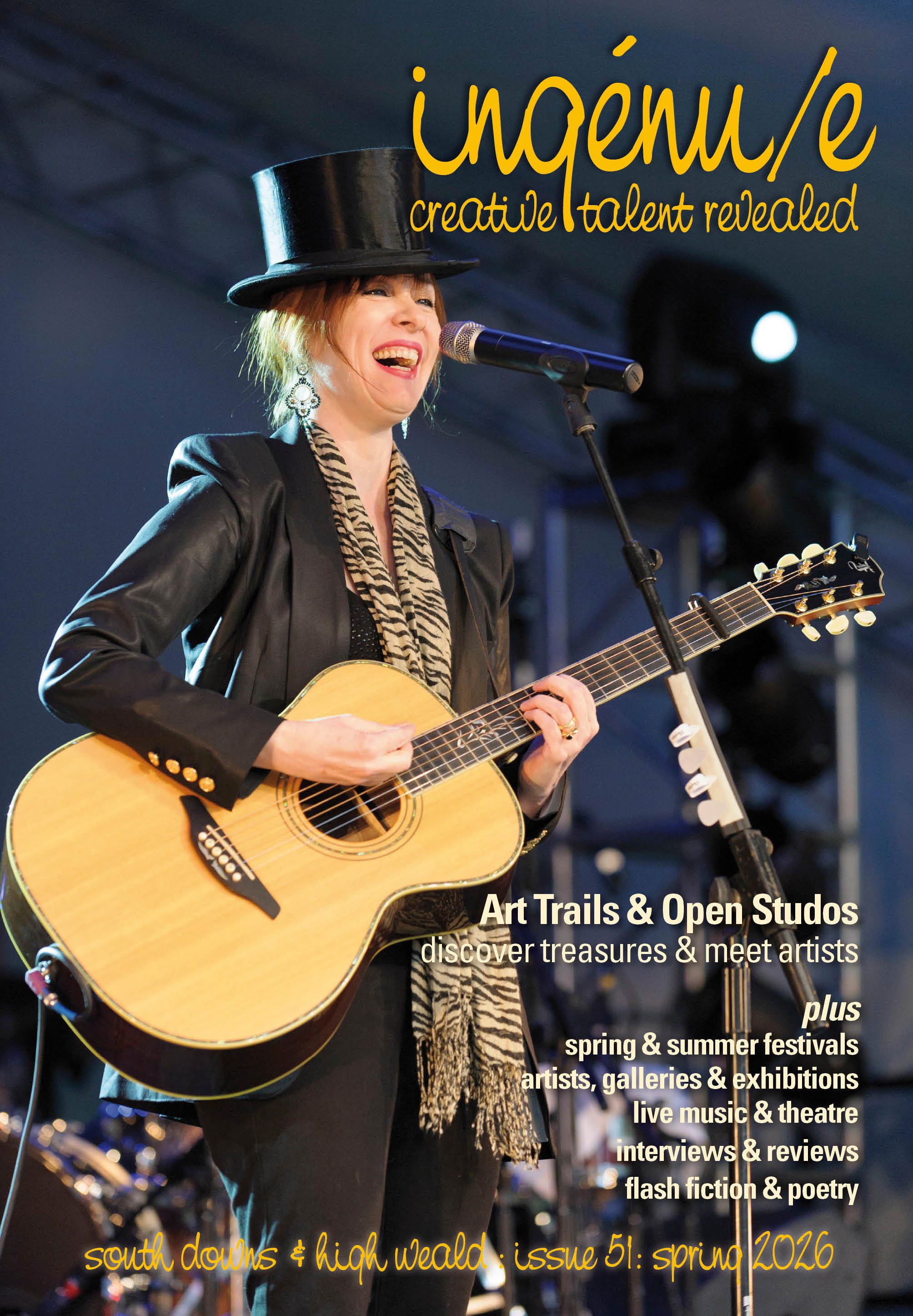 With longer, warmer days everything starts to wake from its wintry slumber. Birdsong, sweet to our ears, proclaims territory and calls for mates. Early flowers provide nectar for newly emerging bees and, seemingly almost overnight, trees are clothed in fresh sappy green. Spring has arrived. With it comes a flurry of creative energy as art trails and open studios events fill the calendar, festivals get under way and creative courses’ summer schools are planned. All these things and more can be found in this Spring issue of ingénu/e.